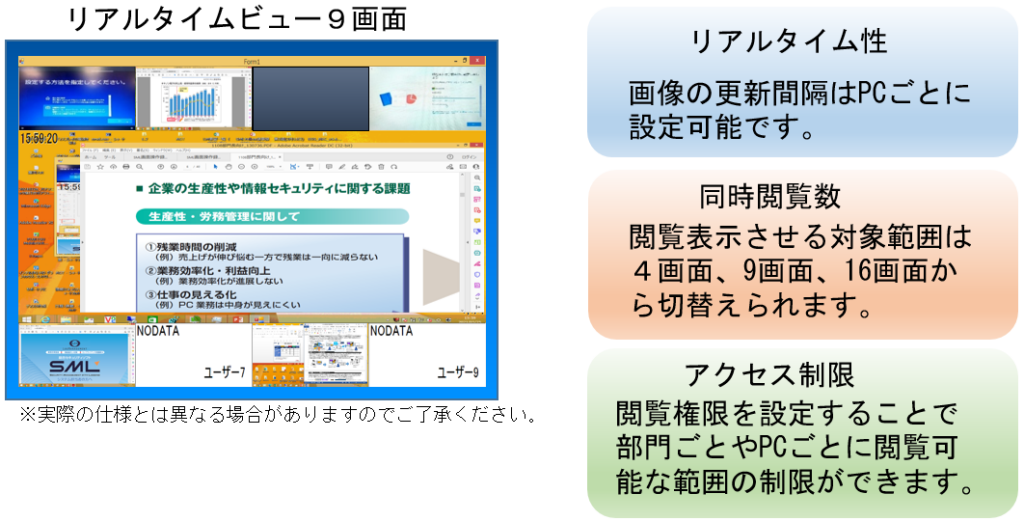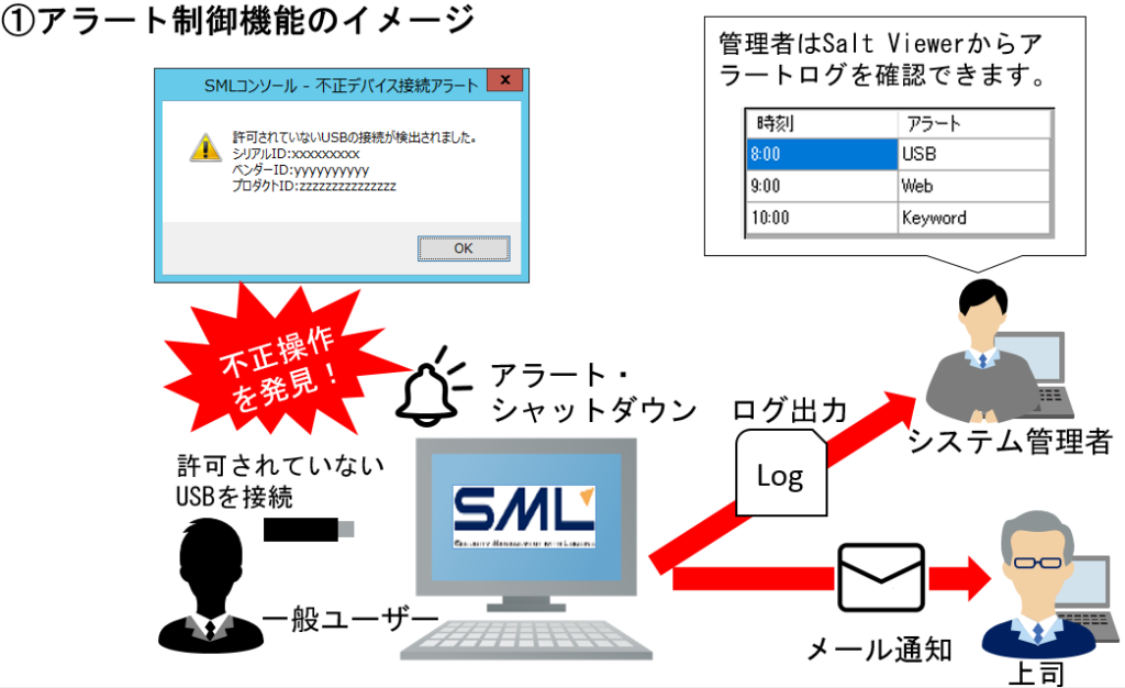 ログ出力 / ユーザーへのアラートメッセージ表示 / 上司・管理者へのメール通知 / PCシャットダウン録画