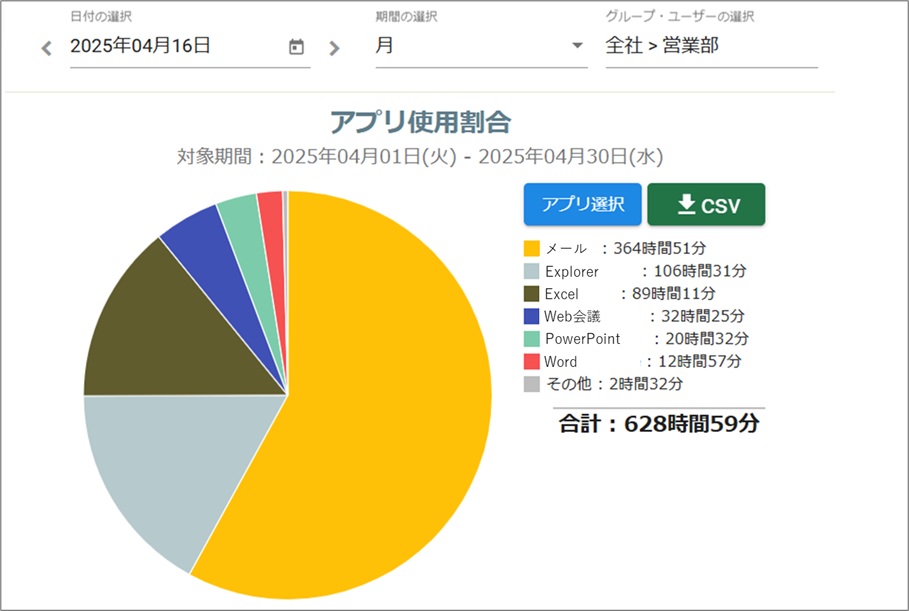 ユーザー・部門別にアプリケーションごとの使用割合を表示します。