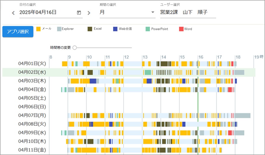 3業務状況がわかる何時から何時まで業務をしていたかだけでなく、ワンクリックでその時間帯に利用していたアクティブウィンドウのタイトルが表示されるので、業務内容が簡単にわかります。アプリケーションの使用時間も記録されるため、自身の業務の振り返りや業務ごとの時間の把握に役立ちます。