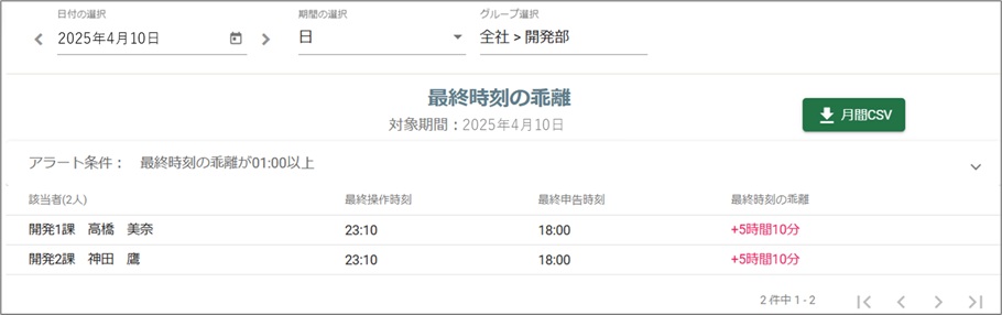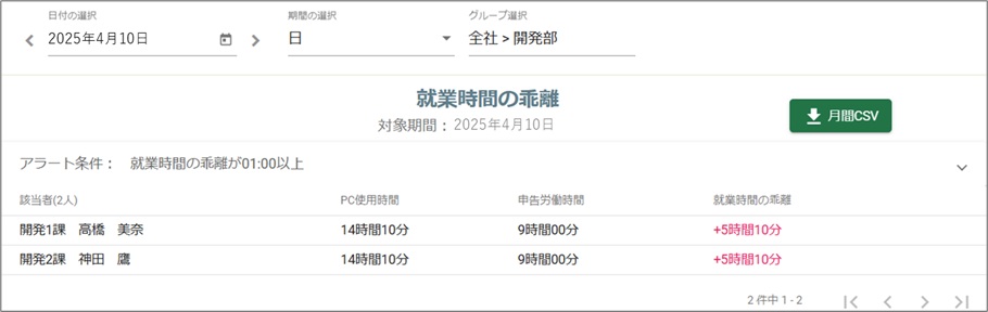 - 1勤怠実績との乖離がわかる勤怠システムから勤怠実績を取り込み、PC利用実績との乖離を確認できます。