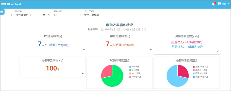 部門ごとにPC利用実績・勤怠実績・乖離を表示します。