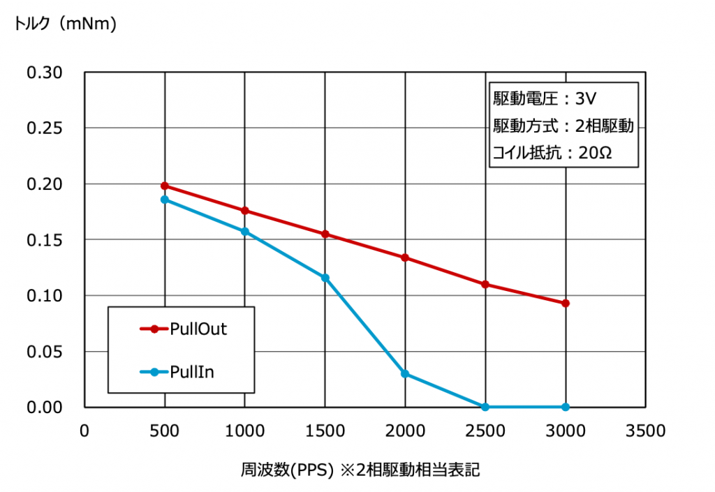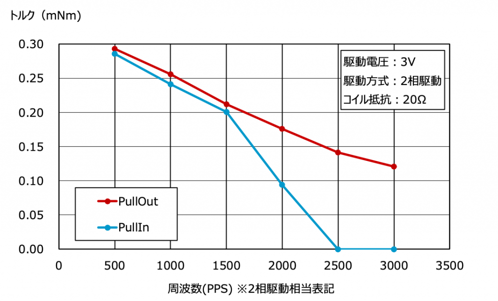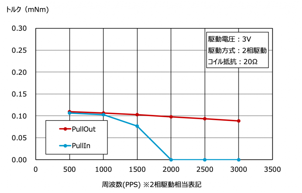 周波数[PPS] 500 1000 1500 2000 2500 3000 PullOut 0.110 0.107 0.103 0.098 0.094 0.089 PullIn 0.107 0.103 0.077 0.000 0.000 0.000