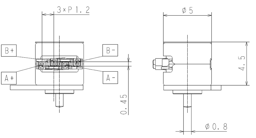 外径 ※1 Φ5 mm 全長 ※2 4.5 mm 質量 0.5g 励磁方式 2相励磁バイポーラ駆動 ステップ角 18°(20step) コイル端子 樹脂 0.4 mm x 0.5 mm 駆動電圧 3.0Vdc コイル抵抗 ※3 20Ω/相 ※1 外径はコイル部を除く。