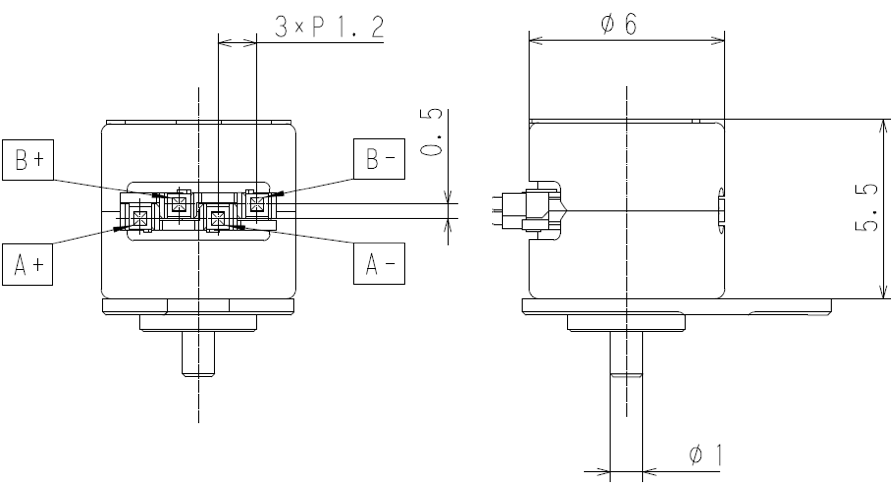 外径 ※1 Φ6 mm 全長 ※2 5.5 mm 質量 0.8g 励磁方式 2相励磁バイポーラ駆動 ステップ角 18°(20step) コイル端子 樹脂 0.4 mm x 0.4 mm 駆動電圧 3.0Vdc コイル抵抗 ※3 20Ω/相 ※1 外径はコイル部を除く。