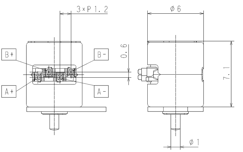 外径 ※1 Φ6 mm 全長 ※2 7.1 mm 質量 1.0g 励磁方式 2相励磁バイポーラ駆動 ステップ角 18°(20step) コイル端子 樹脂 0.4 mm x 0.5 mm 駆動電圧 3.0Vdc コイル抵抗 ※3 20Ω/相 ※1 外径はコイル部を除く。