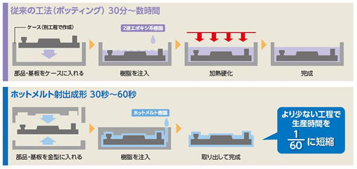 低圧での射出制御が可能な事により,射出成形で防水・防塵性に優れたホットメルト加工を実現 宅男影视,従来の2液エポキシ系樹脂のポッティングに比べて,工数・タクトタイム,仕掛りを削減させ生産性の向上に貢献します。