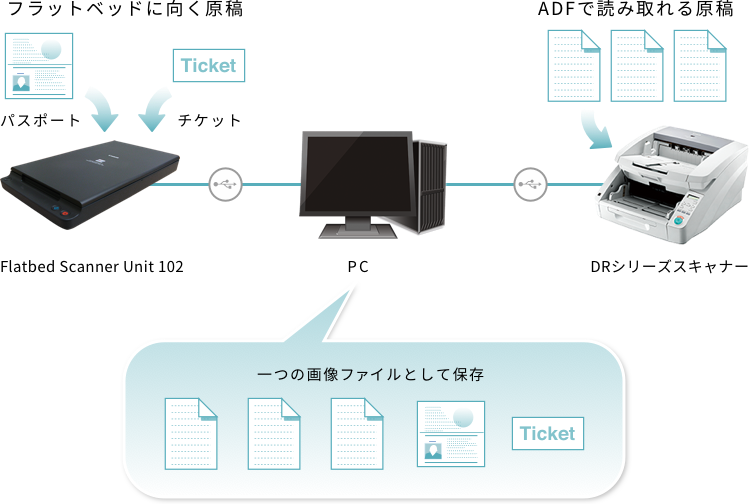 通常サイズの原稿はDRスキャナーで,チケットやリーガルサイズの薄紙,パスポートなどのブックタイプの原稿といったADFでは搬送できない原稿はFlatbed Scanner Unit 102で,というように,原稿の種類に応じて使用するスキャナーを切り替えることで,効率的に原稿を電子化することができます,そして,それぞれのスキャナーでスキャンした画像データは 宅男影院,1ファイルとして保存することが可能です,後から編集する必要はありません。